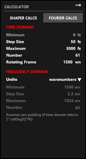 Shape determines the shape of the pulse in the frequency domain experiment. Possible values are "Square", "Gaussian", "Lorenztian", "Etalon", and "Reverse Etalon". Note that the "Etalon" and "Reverse Etalon" options are only compatible with units of "wavenumbers".