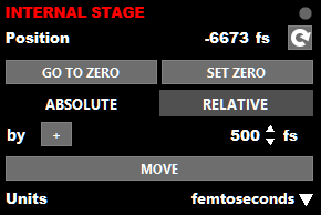 This is one of two delay stage controls. In 2DQuick products this stage is the one inside the 2DQuick enclosure which sets the delay between the shaped pulse and the probe pulse. This can also control any delay stage through the use of the plugin system.