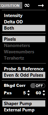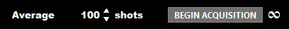 The second shared control is the button to begin an acquisition. The third control is the continuous acquisition option, symbolized by infinity symbol. The behavior of the Begin Acquisition, and the data acquisition, depends on if the continuous acquisition options is enabled or disabled.