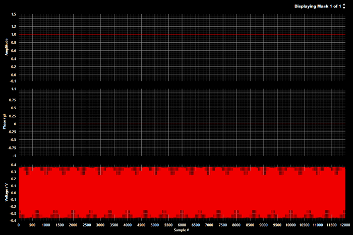 The right had side shows the calculated amplitude and phase masks as well as the RF waveform to be produced by the AWG. If multiple masks are to be output in sequence, you can change which mask is displayed by using the "Displaying Mask" control in the upper left.