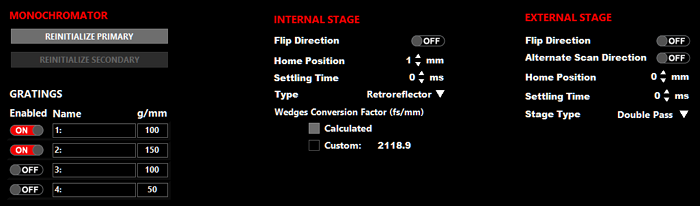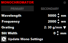 This section is used to control one or two monochromators. If two monochromators are installed, use the PRIMARY/SECONDARY tabs to select the controls for the desired monochromator. If only one monochromator is installed, the PRIMARY/SECONDARY tabs are disabled and only the controls for the primary monochromator will be displayed.