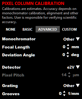 Dispersion Control and Bragg Correction settings ("ADVANCED") apply to two-column (amplitude / phase) custom mask files, but not to one-column (RF) custom mask files.
