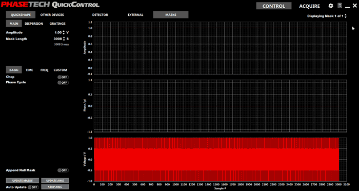 This section consists of two main parts - a Device Control column on the left-hand side of the screen with most of the screen taken up by the Control Display section. The Device Control column is used to control the pulse shaper (all QC Versions) as well as monochromators, delay stages, and shutters (QC Advanced). The Control Display will display data on the calculated pulse shaper mask and detector signals.