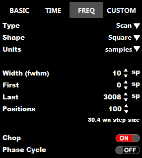 Chop turns on chopping of the scanned pulse. In this case, each frequency is used for 2 sequential laser shots, the first without the scanned pulse and the second with the scanned pulse.